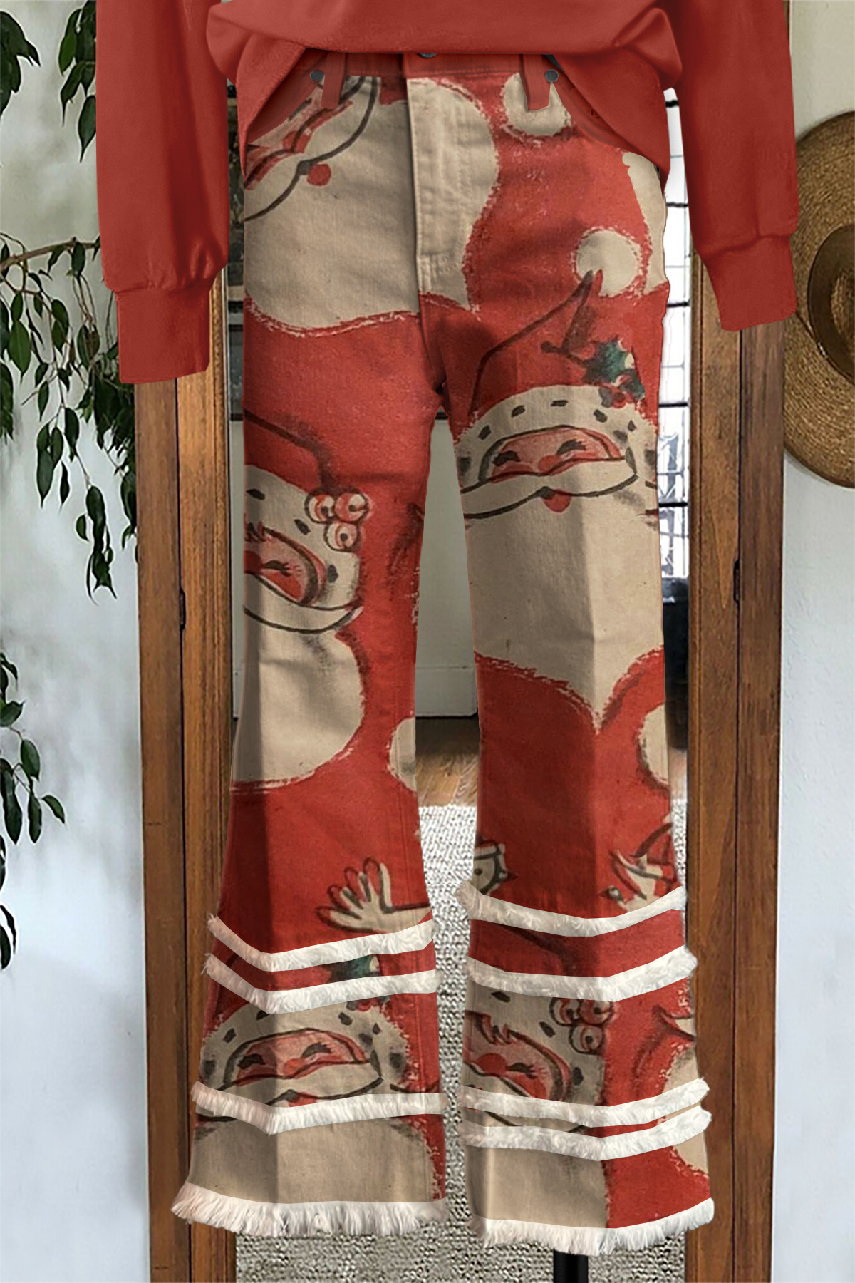 Stay on trend this season in our new colorful, straight cut pants. We especially love the christmas fabric and think this piece will be a new favorite in your closet!