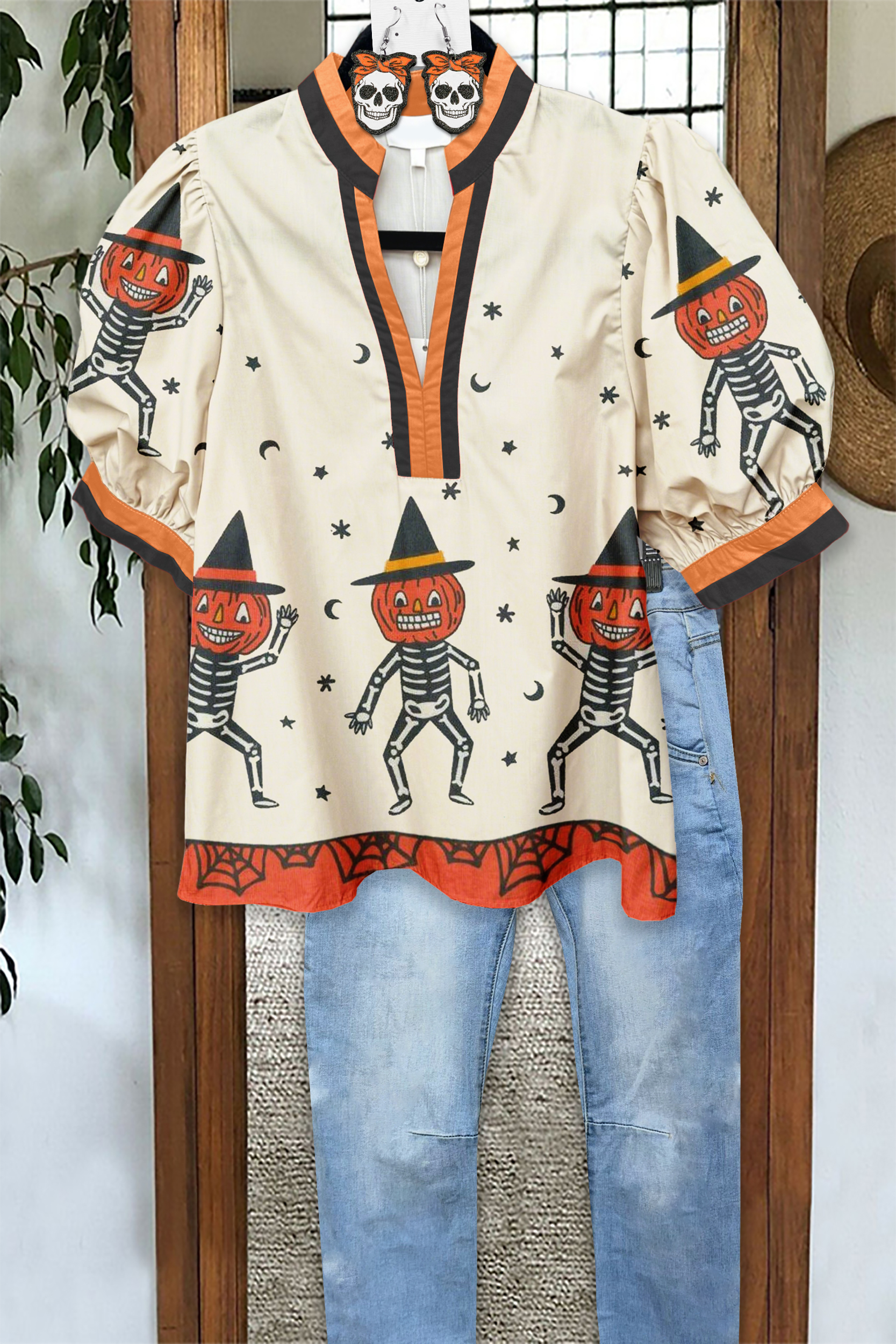Cute Halloween Pumpkin Skull Puff Sleeve Blouse