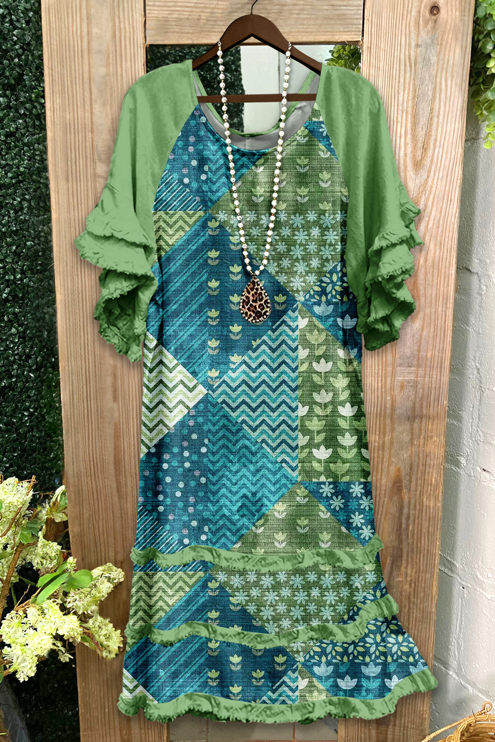 Fresh Floral Patchwork Print Ruffled Raglan Sleeve Dress