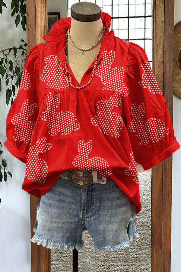 Classic Easter Bunny Polka Dot Print Puff Sleeve Blouse