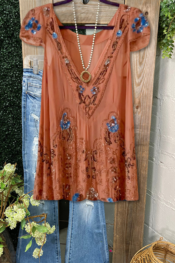 Retro Embroidered Ruffled Patchwork Short-Sleeved Top