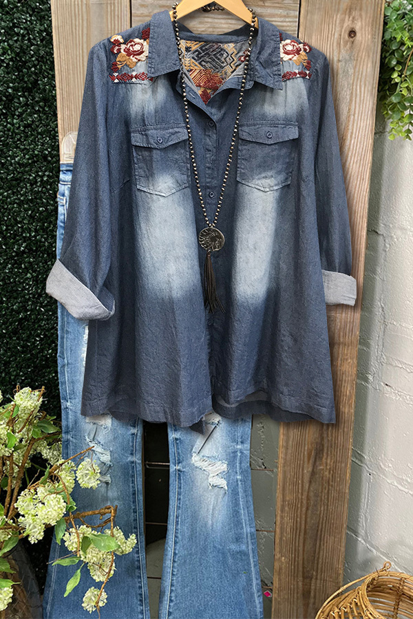 Embroidered Floral Denim A-Line Cardigan Top