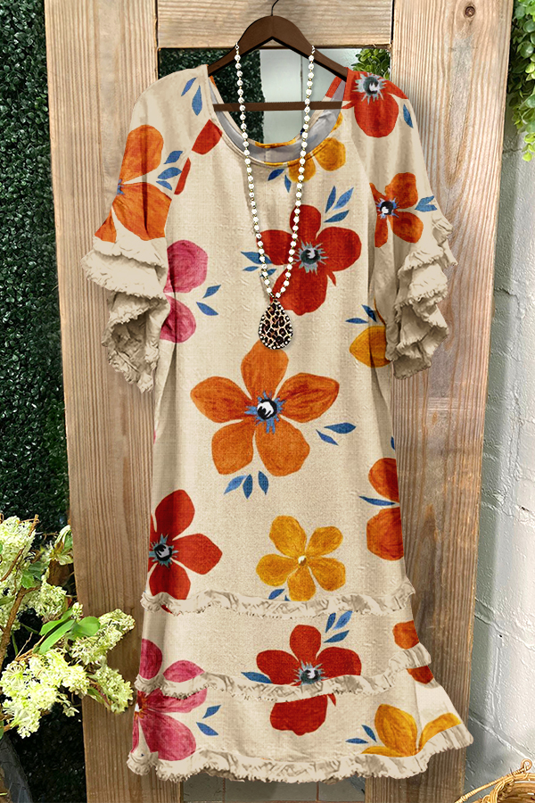 Boho Chic Floral Print Ruffled Raglan Sleeve Dress