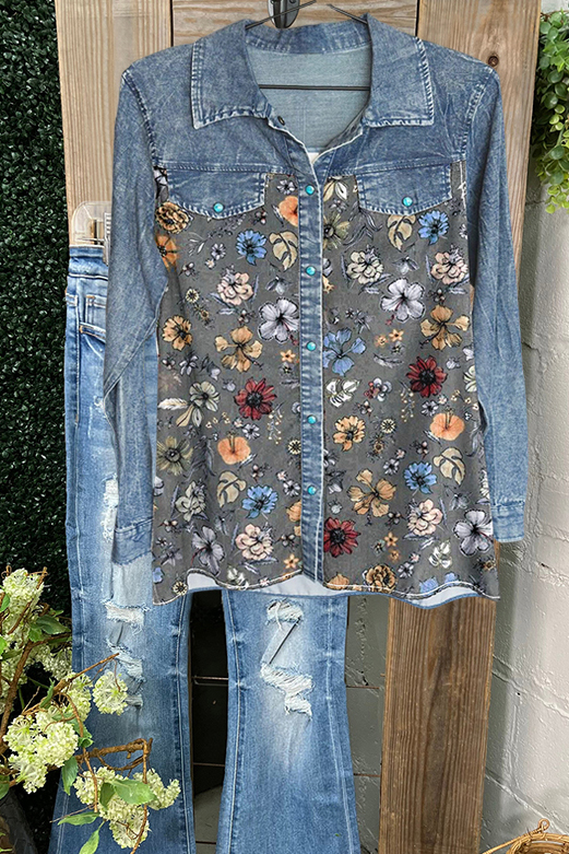 Floral Solid Color Pleated Puff Sleeve Blouse