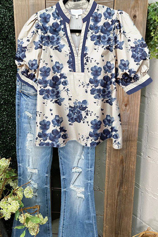 Floral Solid Color Pleated Puff Sleeve Blouse