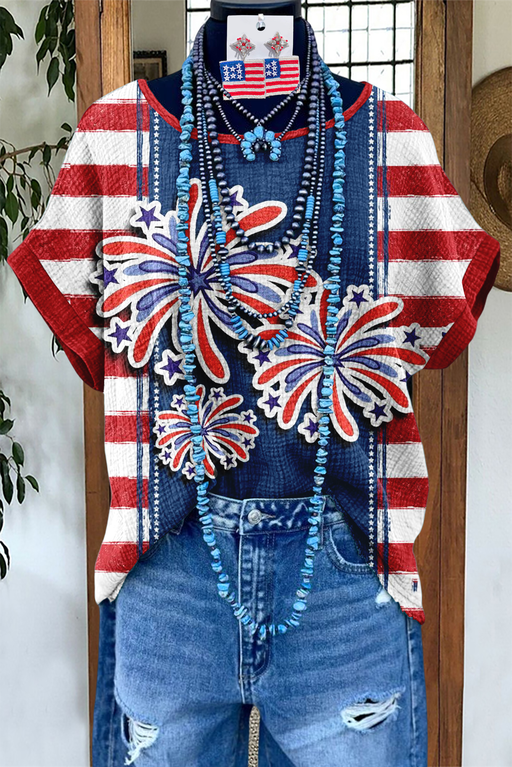 Classic USA Firework Stripe Textured Bat Sleeve T-Shirt