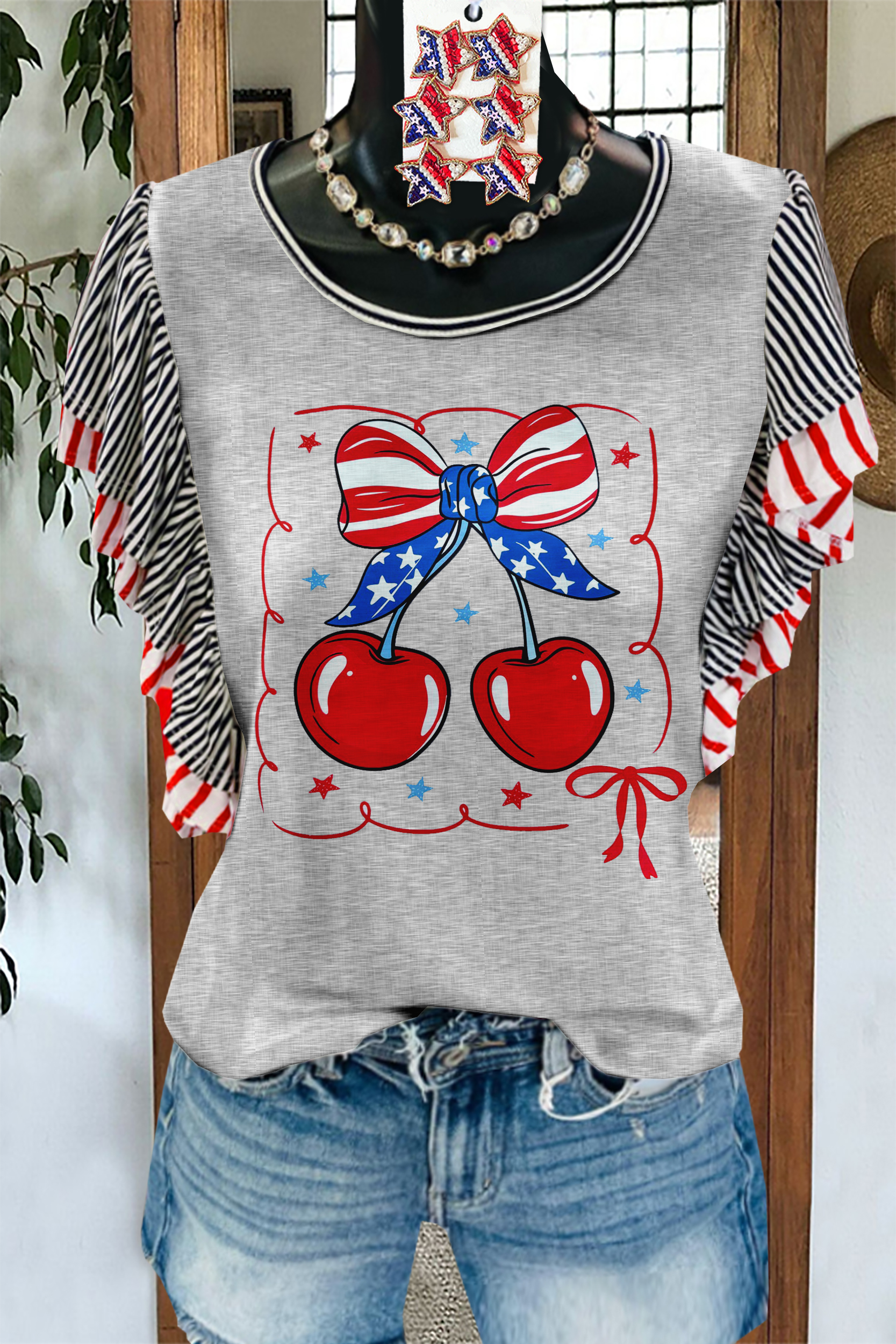 Casual USA Bow Cherry Print Fly Sleeve T-shirt