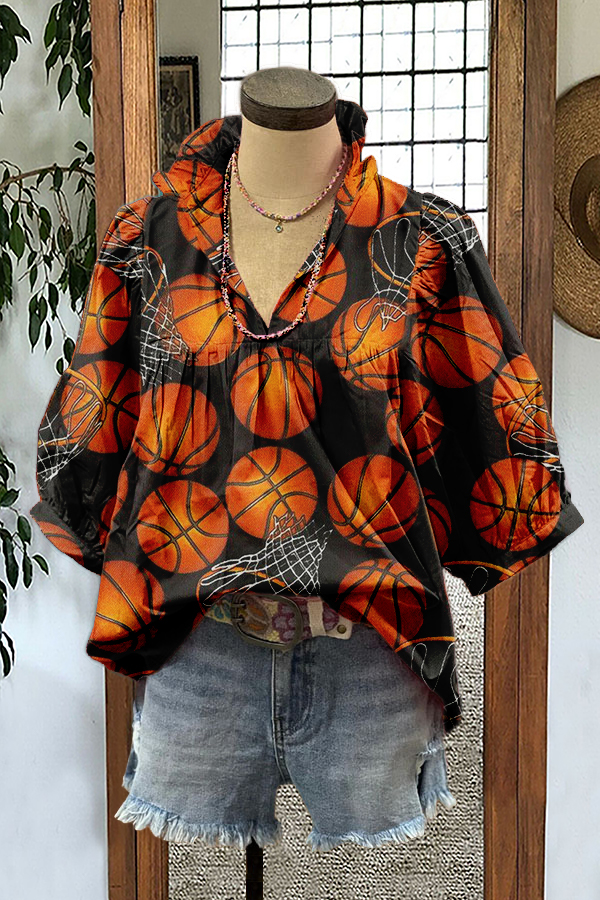Unique Gameday Basketball Print Puff Sleeve Blouse
