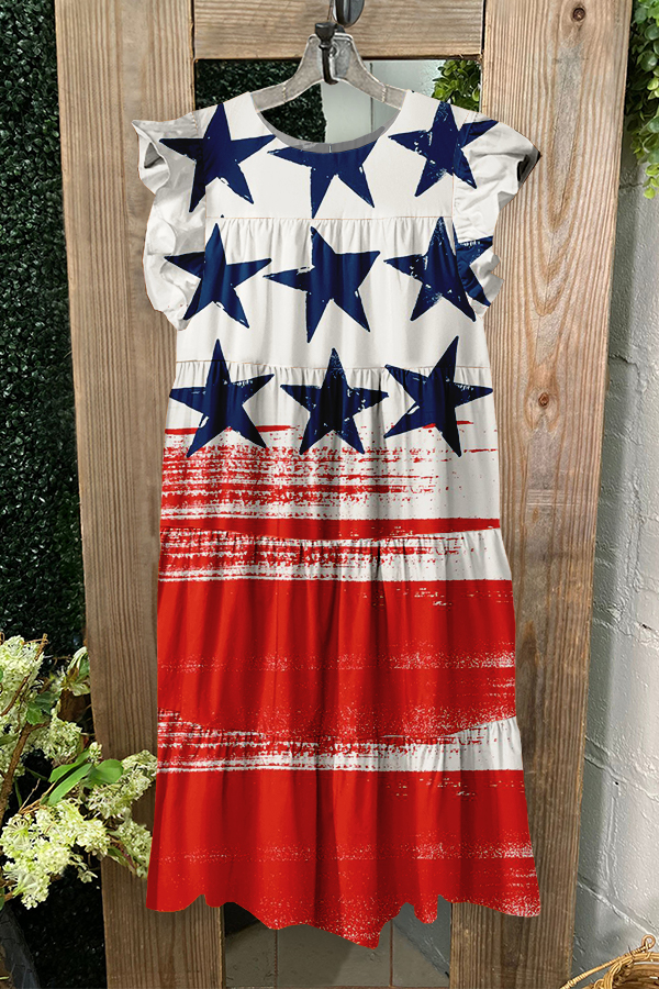 Cute Stars Patriotic Day Print Ruffled Pleated Dress