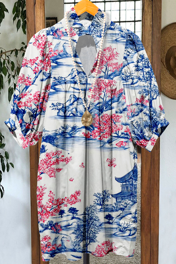 Elegant Puff Sleeve Graphic Print Midi Dress