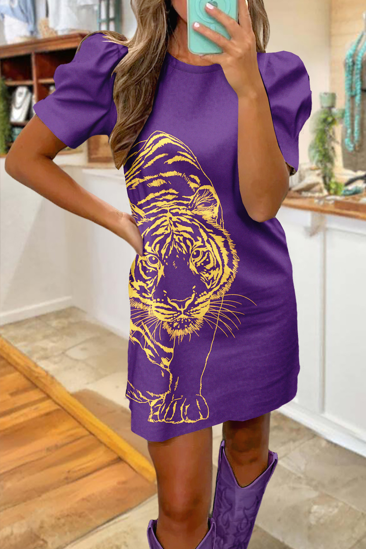 Game Day Purple and Gold Tiger Print Puff Sleeve Dress