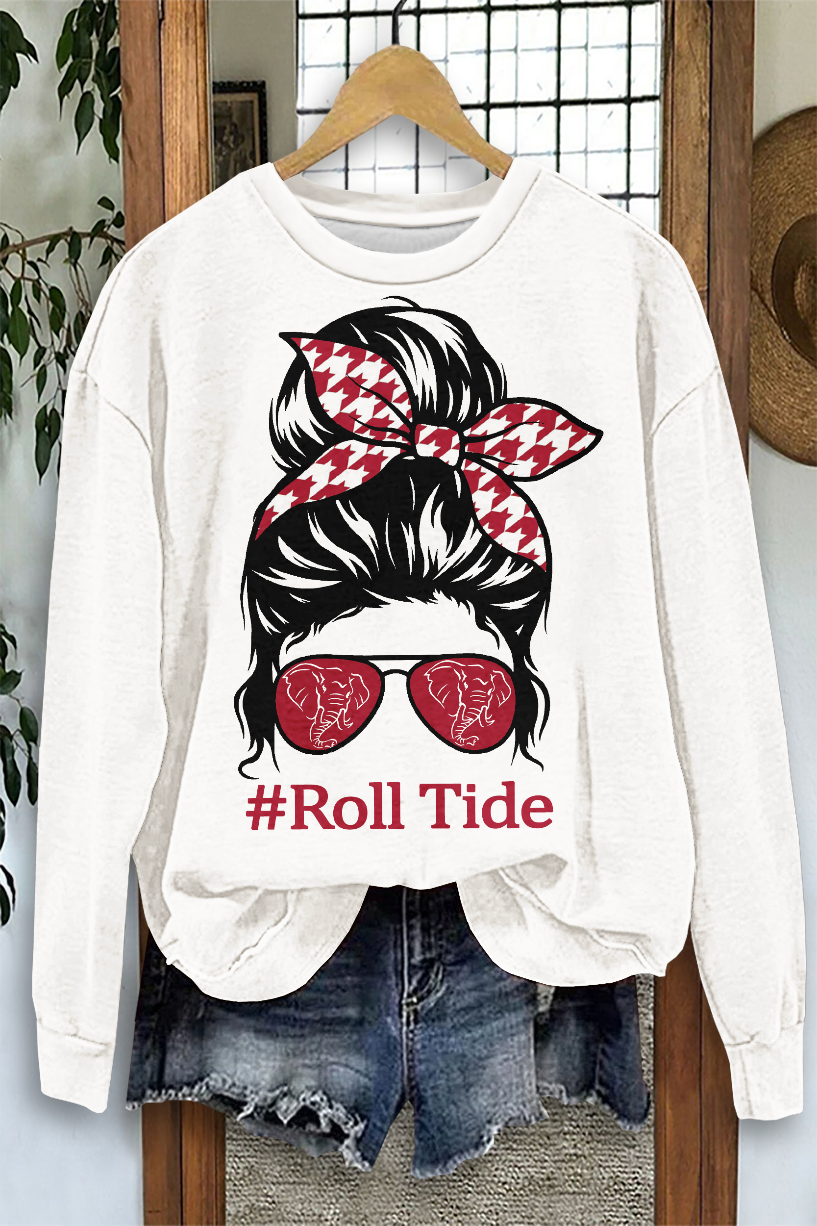 Messy Bun Game Day Red and White Elephant Sweatshirt
