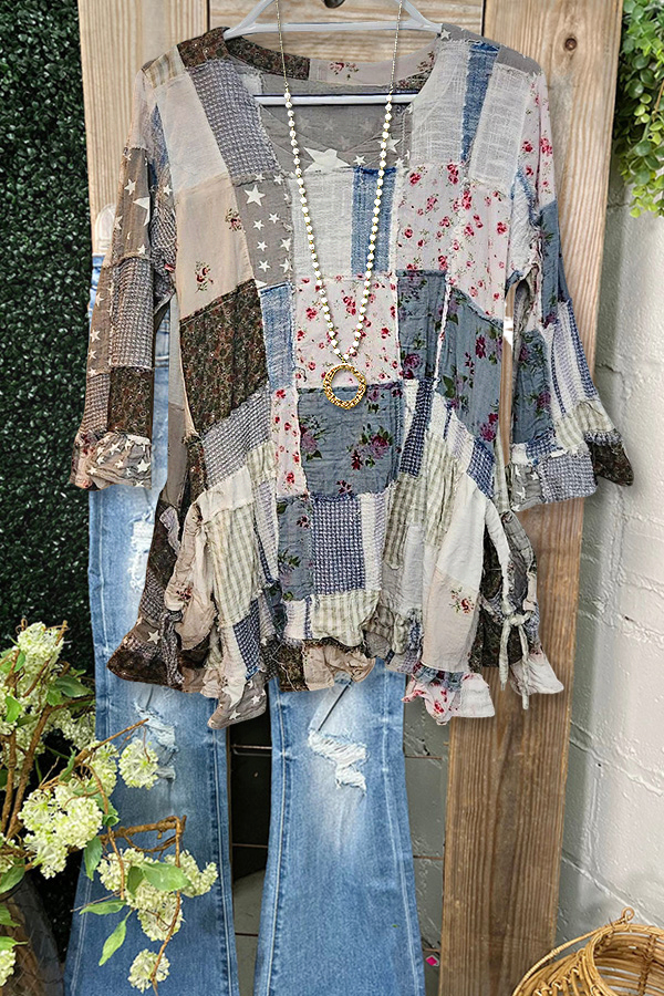 Casual Mixed Print Patchwork Mid-Sleeve Top