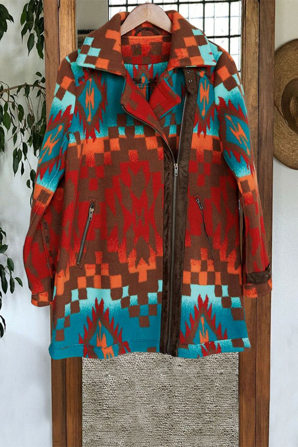 Stay on trend this season in our new casual, lapel coat. We especially love the geometric print fabric and think this piece will be a new favorite in your closet!