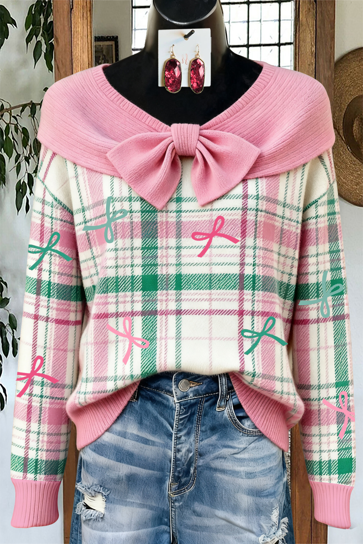 Stay on trend this season in our new sweet, pussy bow sweater. We especially love the graphic print fabric and think this piece will be a new favorite in your closet!